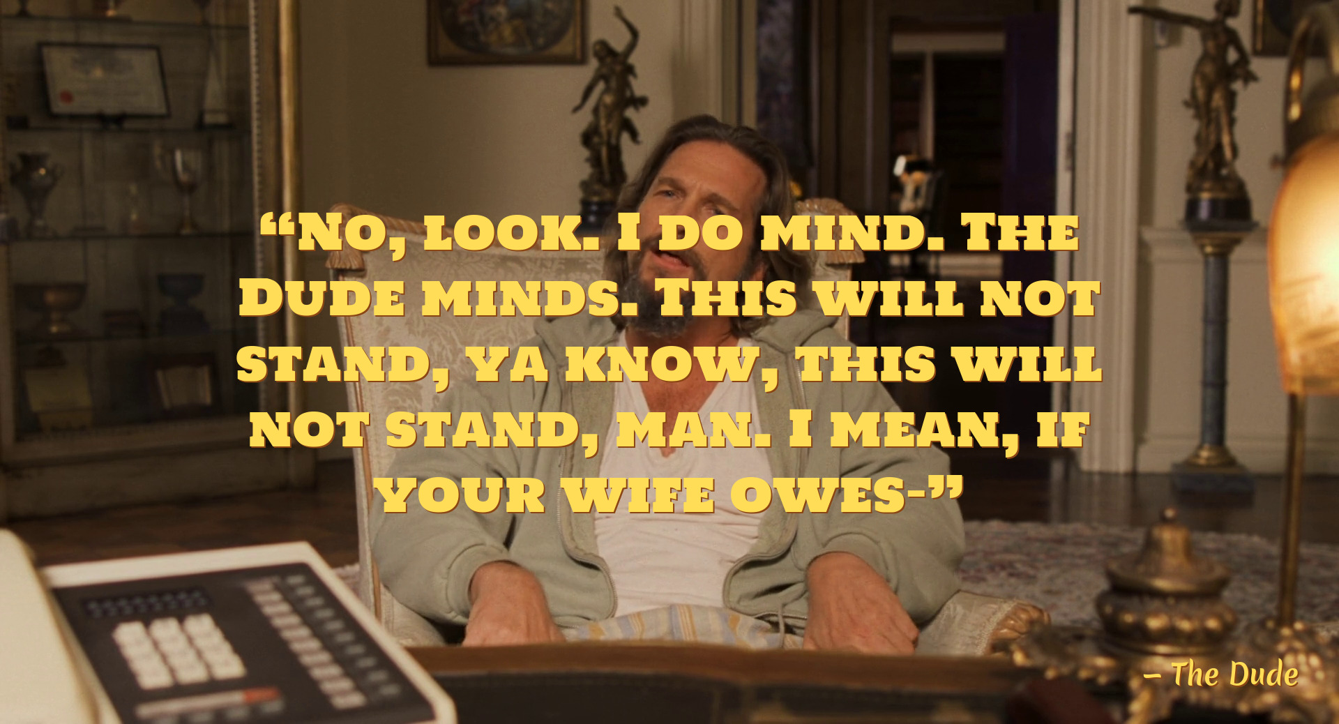 “No, look. I do mind. The Dude minds. This will not stand, ya know, this will not stand, man. I mean, if your wife owes—”